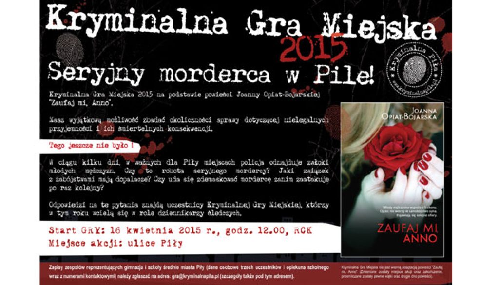 Tegoroczna Kryminalna Gra Miejska – realizowana podczas Festiwalu Kryminału Kryminalna Piła 2015 – odbywać się będzie na podstawie powieści poznańskiej pisarki Joanny Opiat-Bojarskiej pt. „Zaufaj mi, Anno”. Scenariusz gry jest autorską i swobodną adaptacją książki (zmienione zostały miejsce akcji, zakończenie powieści, przemilczane zostały pewne wątki oraz drugie dno powieści).